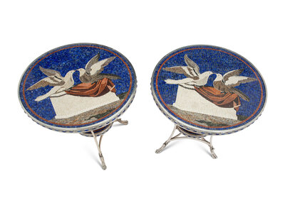The tops encircled by coin molding, lapis lazuli cabochons, and decorated with a mosaic of doves.