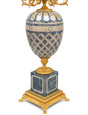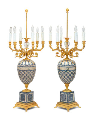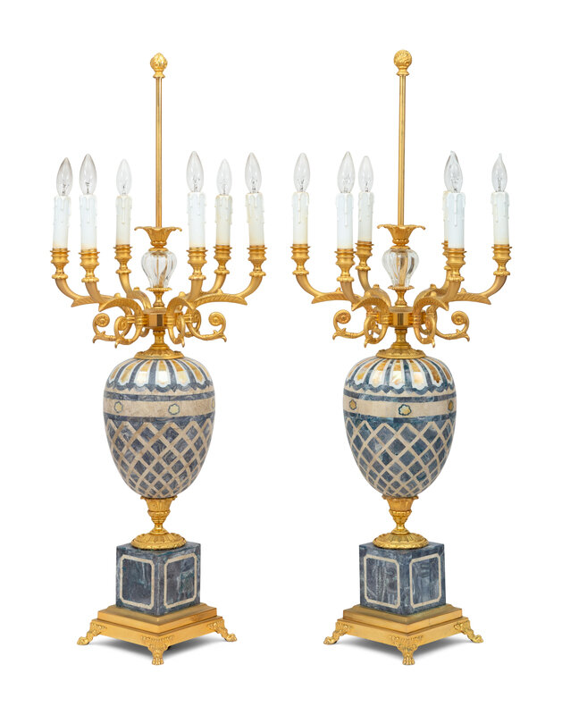 A Pair of Laudarte Ulmus Gilt Bronze, Mother-of-Pearl, and Hardstone Five-Light Table Lamps