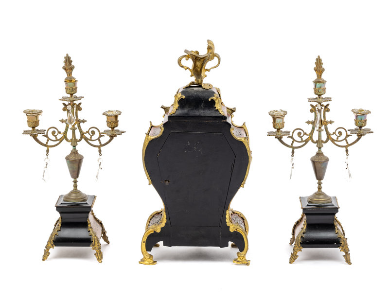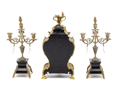 comprising a mantel clock and a pair of two-light candelabra, the clock movement stamped L.F. and further numbered.