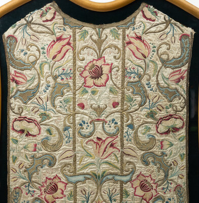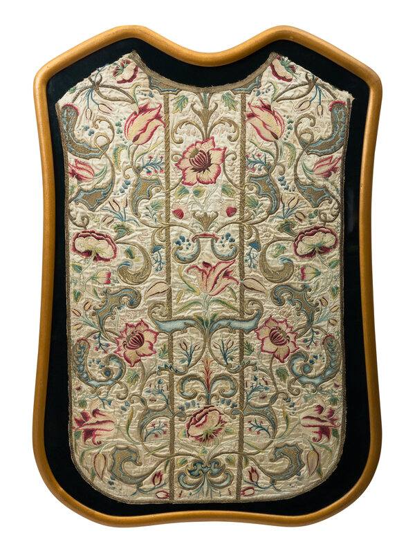 With needlework in silk and gold thread, decorated with tulips and scrolls of various floral and foliate motifs; in a conforming giltwood frame.