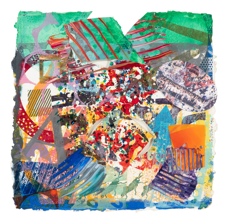 collage of collagraphs with acrylic, metal snaps, and machine-sewn thread on die-cut paper