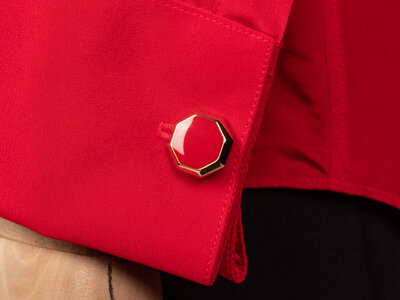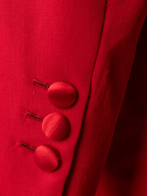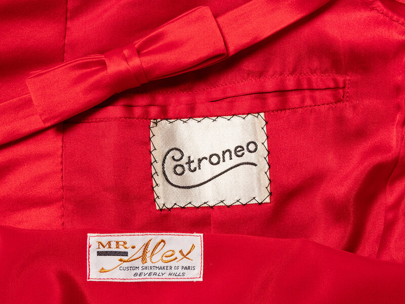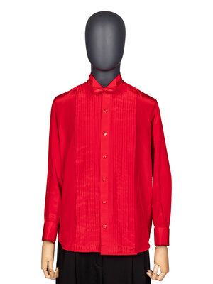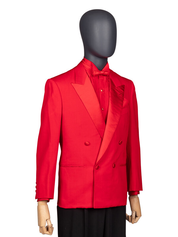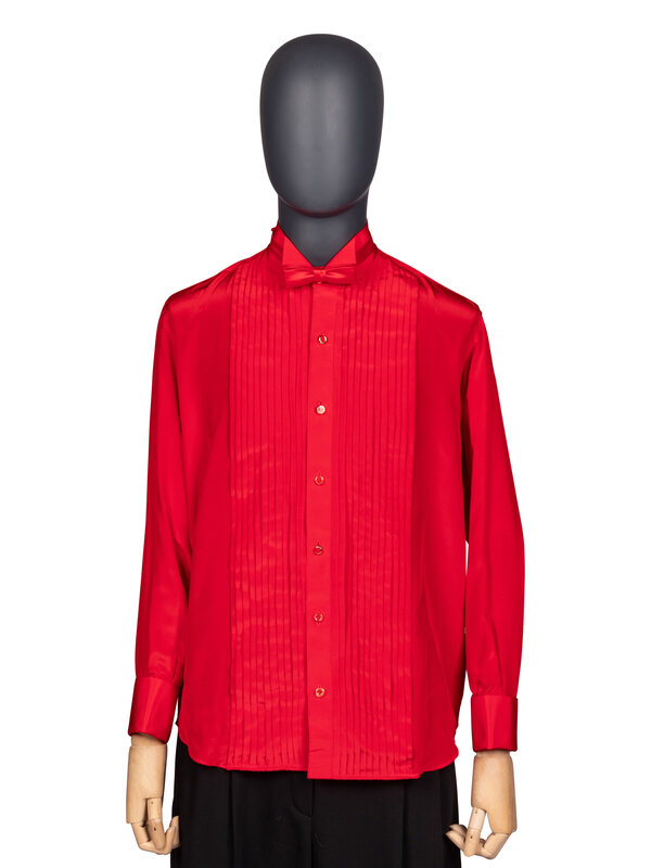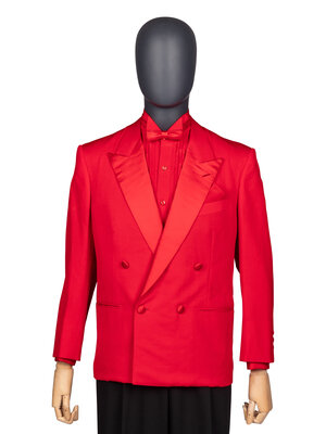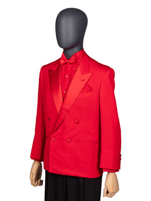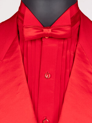 Costume ensemble comprised of a red tuxedo jacket, red tuxedo shirt with gold-tone studs and cufflinks, a red bow tie, and a red silk pocket square. Worn by Joel Grey as 'Adam' in Dallas; Season 14, Episode 23, "Conundrum"; 1991.