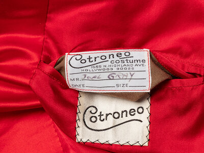 Features "Cortroneo Costume / 1655 N. Highland Ave. Hollywood 90028 / Mr. Joel Gray" tag in interior breast pocket.