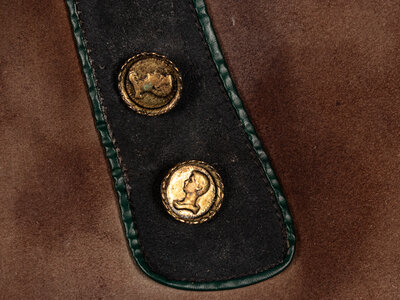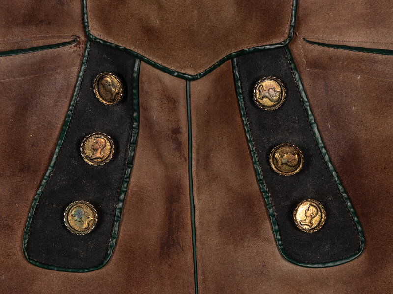 A pair of Austrian brown suede and leather lederhosen with deep brown leather suspender straps with a hand-painted suede chest plate. Reportedly worn by Joel Grey during a production of Cabaret.