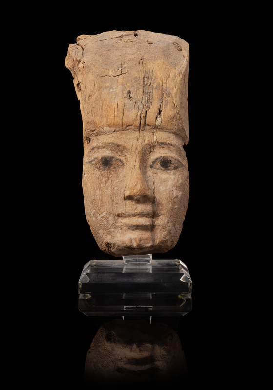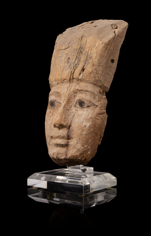 An Egyptian Painted Wood Mummy Mask Height 8 1/4 inches.