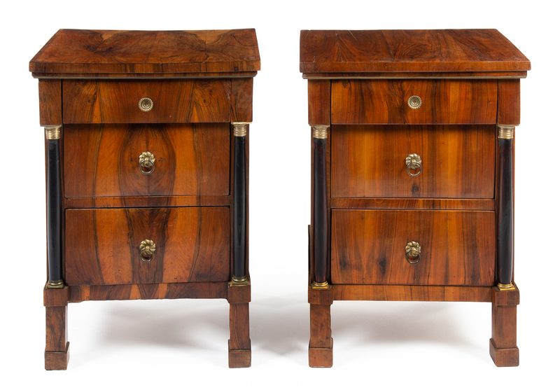 A Pair of Italian Neoclassical Parcel Ebonized Walnut Night Stands Height 32 1/2 x width 23 x depth 17 1/2 inches.