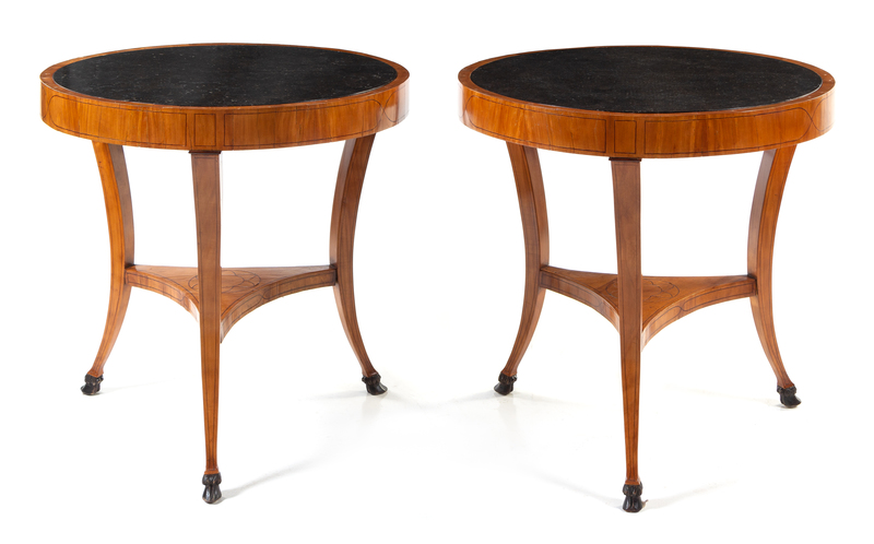 A Pair of Italian Neoclassical Parcel Ebonized Fruitwood Tables Height 32 x diameter of top 32 inches.