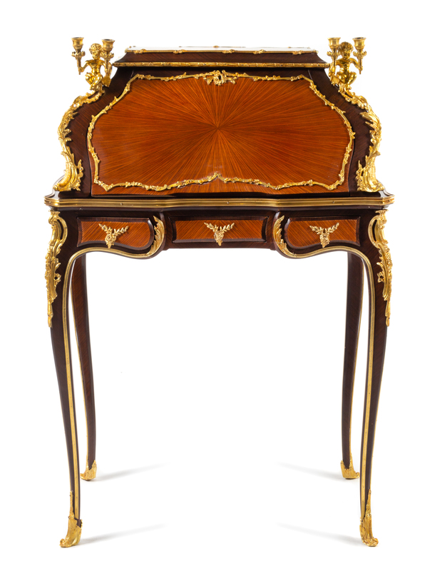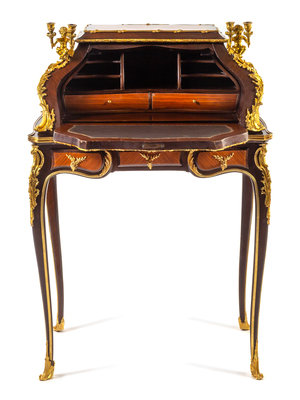 A Louis XV Style Gilt Bronze Mounted Slant-Front Writing Desk Height 42 1/2 x width 29 1/4 x depth 20 3/4 inches.