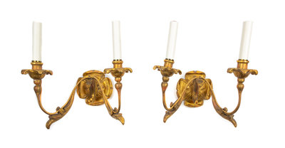 A Pair of Continental Giltwood Two-Light Sconces Width 13 inches.