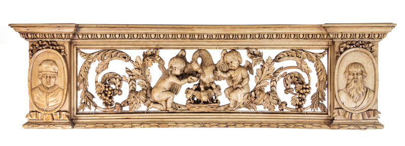 having a molded projecting cornice of breakfront outline above the egg-and-dart frieze and openwork panel centered with a self-mutilating bird and three chicks flanked by two cherubs among foliate scrolls and grape brunches, further flanked by two ribbon-tied oval portrait medallions.