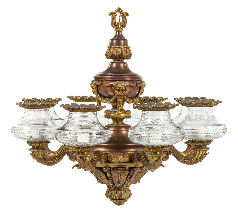 A Neoclassical Gilt Metal Eight-Light Chandelier Height 35 x diameter 25 1/2 inches.