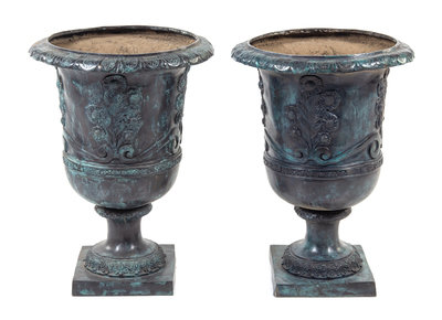 A Pair of Neoclassical Style Painted Cast Iron Planters Height 28 inches.