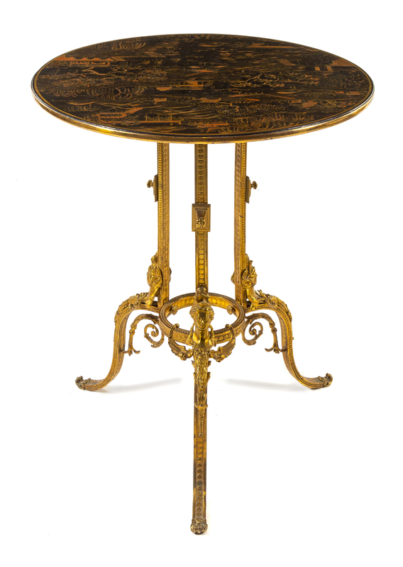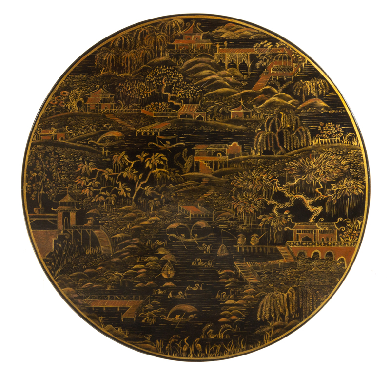 the circular top lacquered to show buildings in a mountainous landscape, set on supports with running-coin decoration and mounted with female masks.