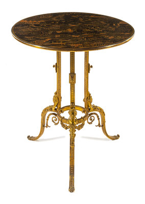 A Neoclassical Style Gilt Bronze and Lacquered Side Table Height 37 x diameter of top 26 1/2 inches.