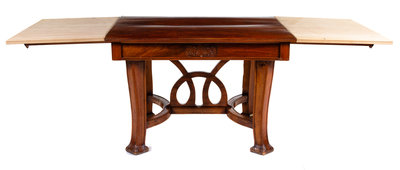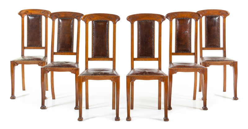 An Italian Art Nouveau Style Walnut Dining Suite Height of table 31 1/2 x width 47 1/2 (closed) x depth 40 1/4 inches.
