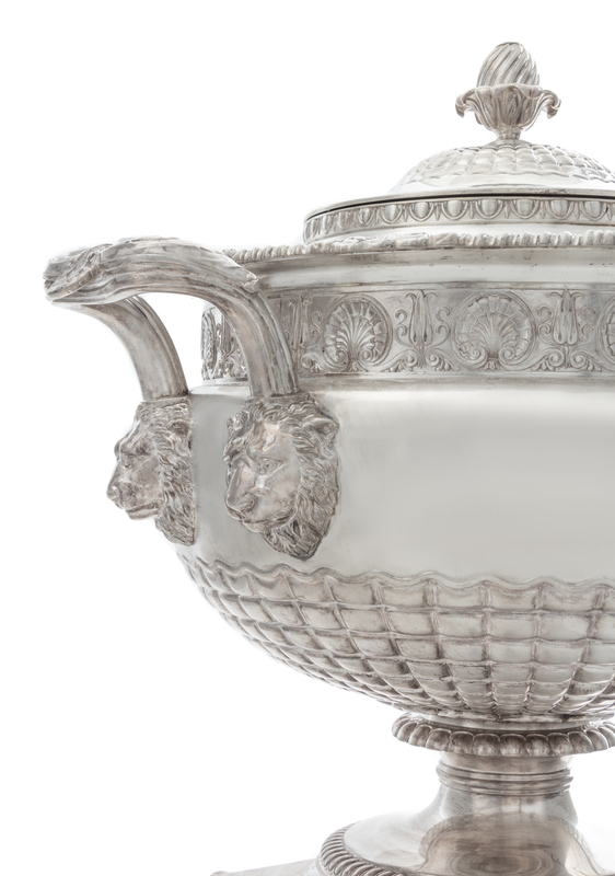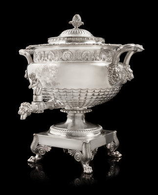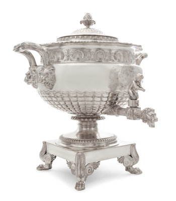 A George III Silver Tea Urn, Paul Storr, London, 1813, the domed lid with a blossom finial, the body with a gadroon and rocaille rim ab