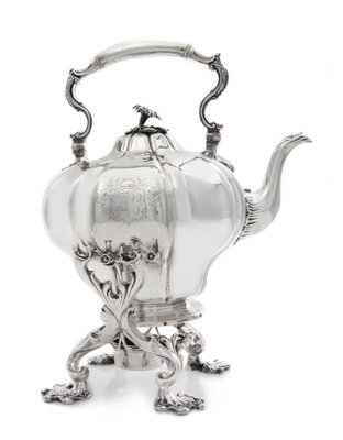 A William IV Silver Kettle-on-Stand, J. Wrangham & William Moulson, London, 1836, the domed lid with a floral finial above the fluted b