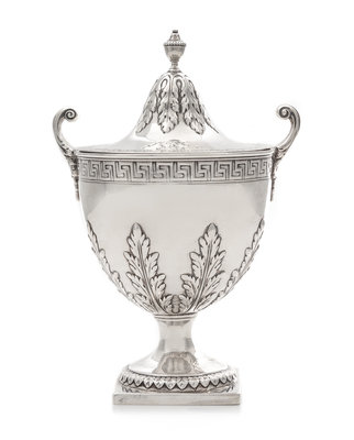A George III Covered Sugar, Elizabeth Roker, London, 1775, the beaded urn form finial above the acanthus decorated lid, the body with b