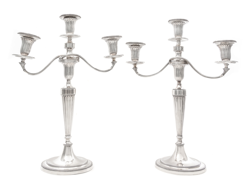 A Pair of George III Silver Three-Light Candelabra, John Schofield, London, 1781; the Branches Marked for 1796, each fluted tapering st