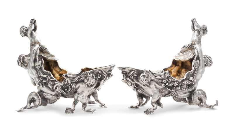 A Pair of Victorian Silver Figural Sauce Boats, Charles Stuart Harris, London, 1879, each surmounted by a merchild blowing a conch shel