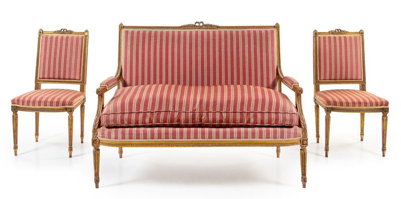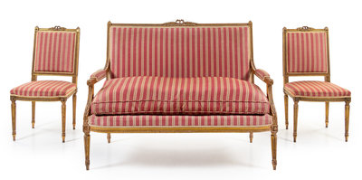 A Louis XVI Style Giltwood Salon Suite Height of settee 41 x width 54 x depth 32 inches.