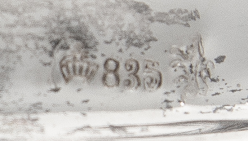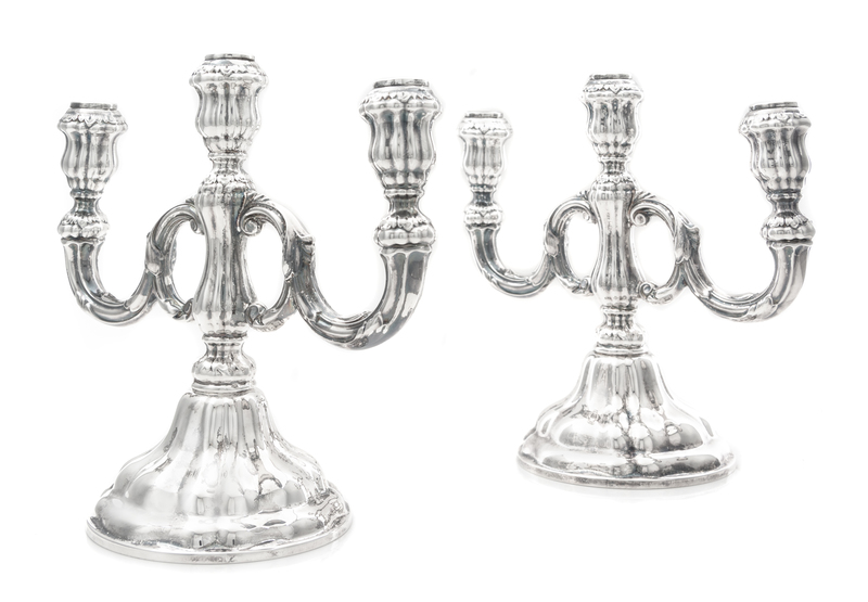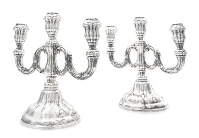A Pair of German Silver Three-Light Candelabra, Gebruder Deyhle, Schwabisch Gmund, 20th Century, each stem issuing two scrolling candle