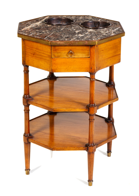the octagonal marble top with a brass banded edge fitted with two wells above the conforming frieze fitted with a single drawer, raised on ring-turned columnar legs joined by two medial shelves and ending in brass caps.