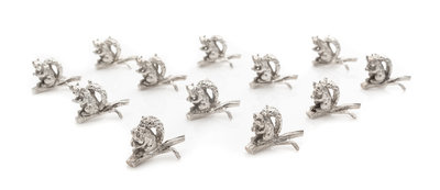 A Set of Twelve American Silver Zoomorphic Placecard Holders, Tiffany & Co., New York, 20th Century, each in the form of a squirrel wit