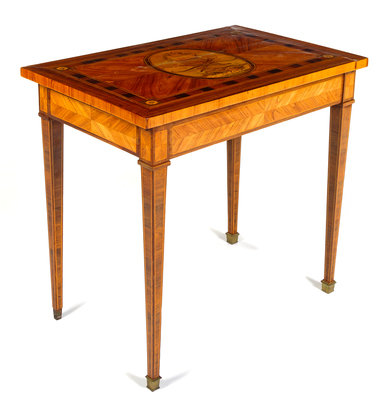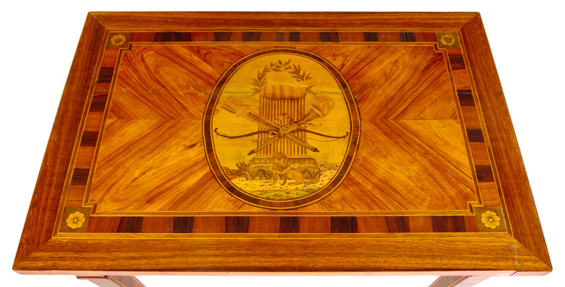 the rectangular quarter-veneered top centered with an oval cartouche depicting a lion before a fluted column and a trophy, over a conforming frieze, raised on square tapering legs ending in brass caps.