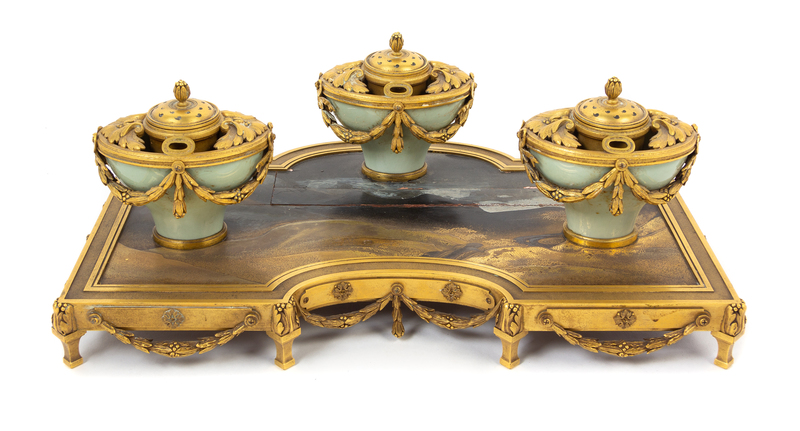 A French Gilt Bronze, Celadon Porcelain and Japanese Lacquer-Inset Encrier Height 6 3/8 x width 16 1/4 inches.