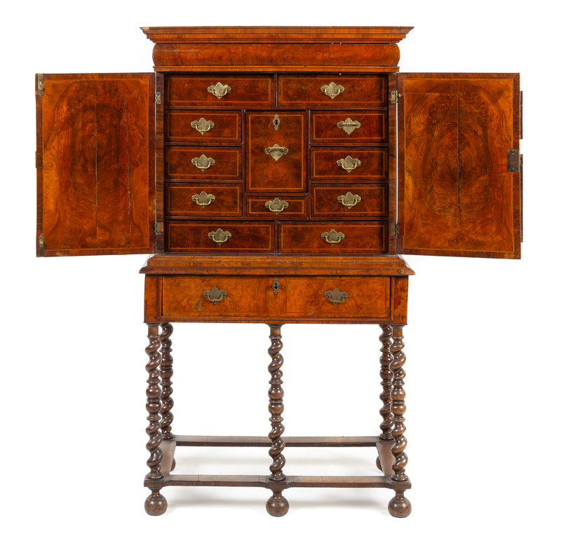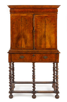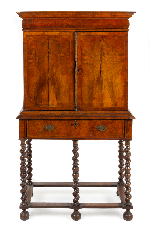 A William and Mary Burl Walnut Cabinet on Stand Height 63 1/2 x width 35 x depth 19 inches.