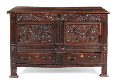 A William and Mary Oak Chest Height 35 x width 52 x depth 22 1/2 inches.