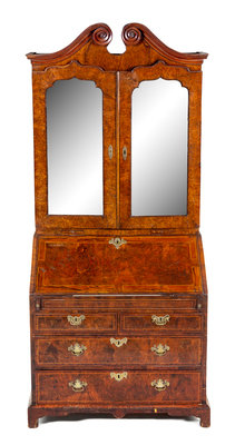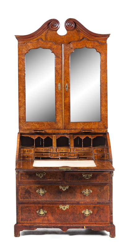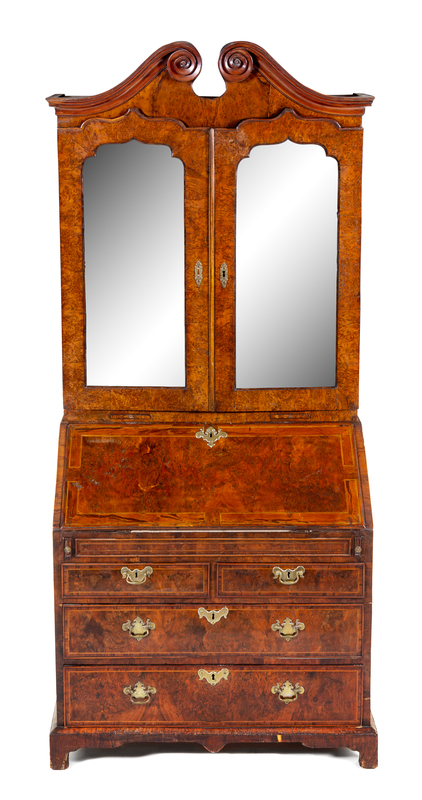in two parts, the superstructure having a scrolled broken arch pediment above two beveled mirror-inset doors and two candle slides, the base fitted with a fall-front writing surface opening to a fitted interior, further over two short drawers and two long drawers, raised on bracket feet.