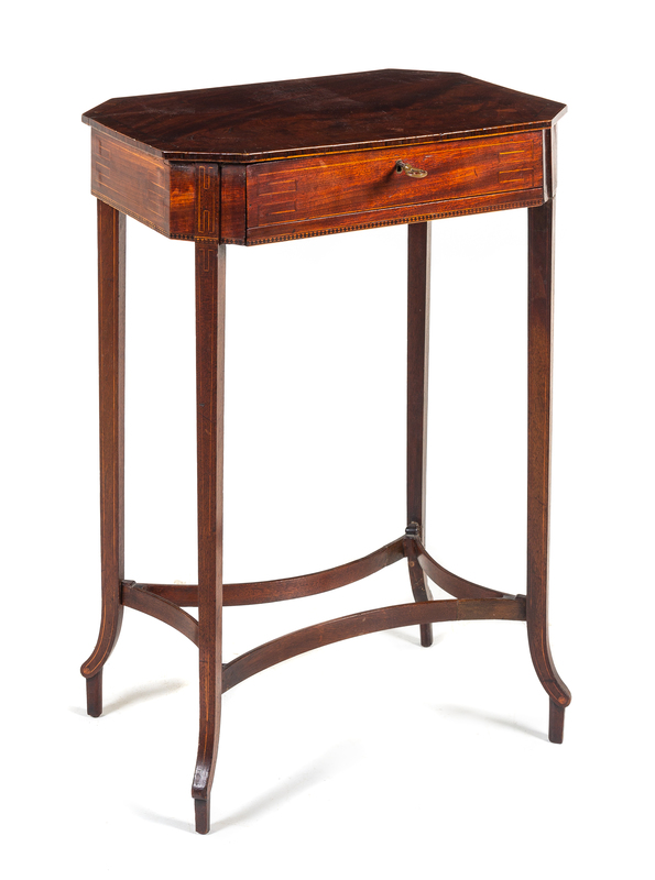 the rectangular top with canted corners above the single frieze drawer, raised on square tapering legs joined by concave stretchers.