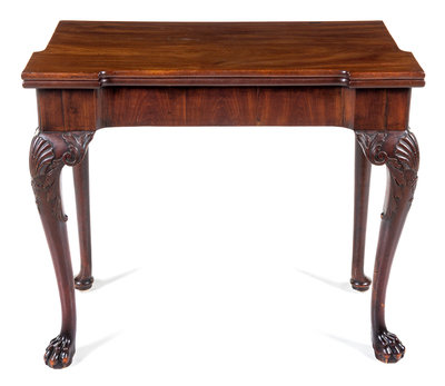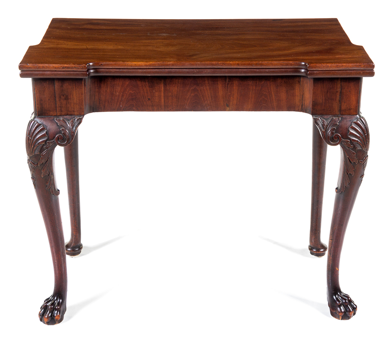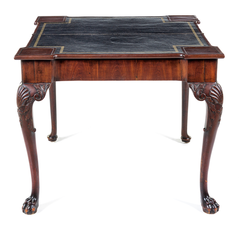 the rectangular top opening to a leather-inset square top, raised on shell- and husk-carved cabriole legs ending in paw fore-feet.