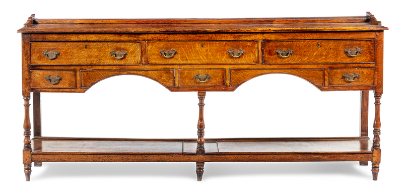 A George III Provincial Oak Sideboard Height 35 1/2 x width 83 1/2 x depth 16 1/2 inches.