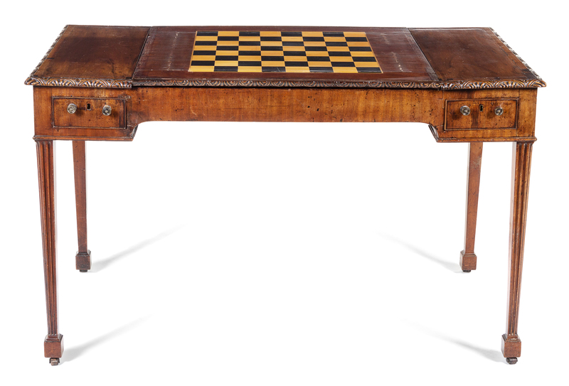 the rectangular top with an inset game board above the frieze fitted with two drawers and two opposing drawers, raised on square fluted tapering legs ending in block feet and casters.