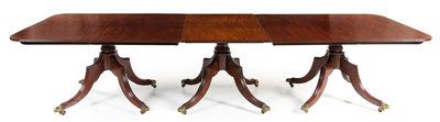 the rectangular top with rounded corners and a reeded edge, the three pedestals each having four downswept legs ending in brass paw form caps and casters, together with a set of custom table pads and two D-shaped ends for converting the whole into a pair of matching tables.