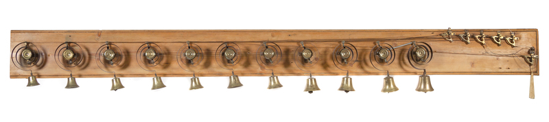 A Set of English Brass Service Bells Width of rack 111 inches.