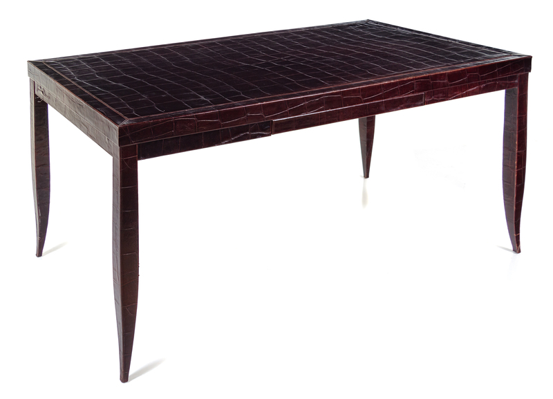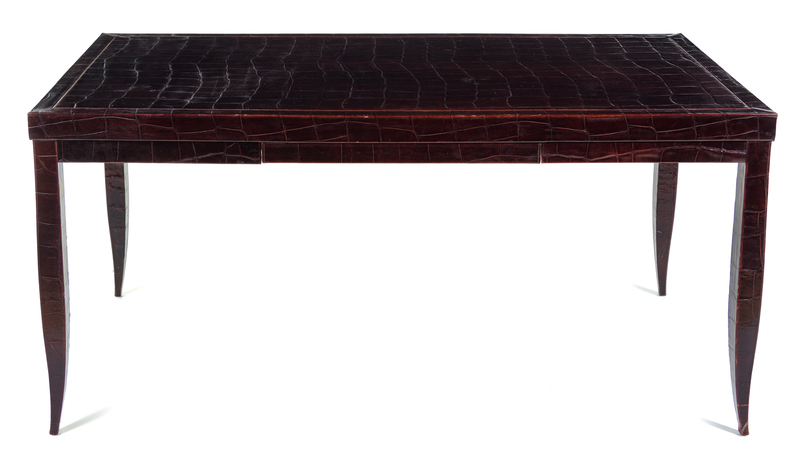 An Art Deco Style Embossed Leather-Veneered Writing Table Height 30 1/2 x width 53 x depth 33 inches.