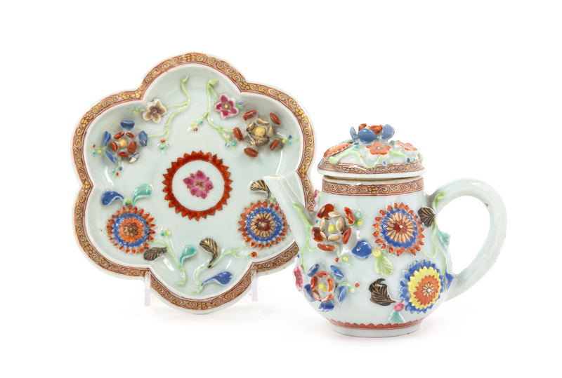 A Chinese Export Porcelain Teapot and Stand Height of teapot 5 1/2 inches.
