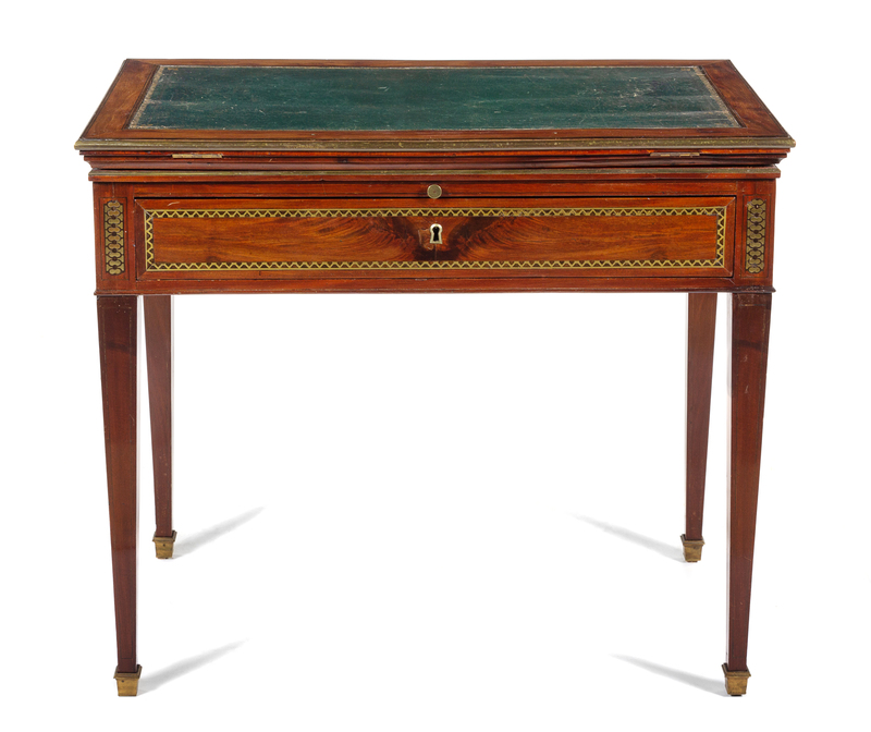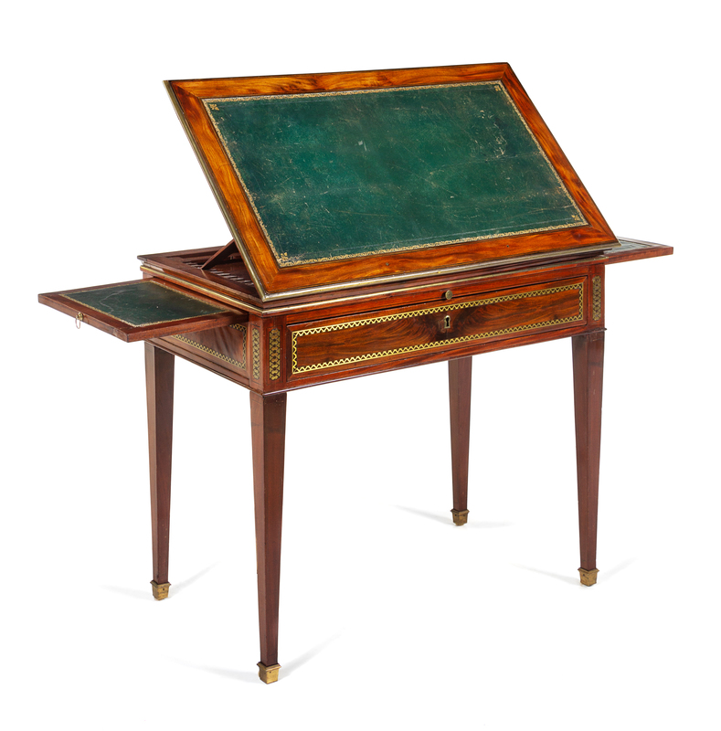 A Directoire Mahogany Drafting Table Height 29 1/2 x width 34 3/8 x depth 20 1/4 inches (closed).