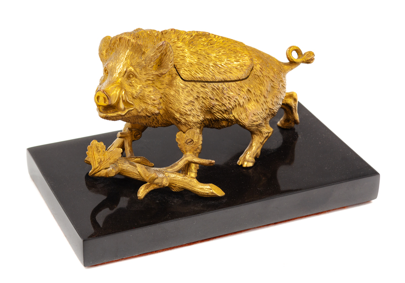in the shape of a boar with a hinged back, mounted on a later black marble base.