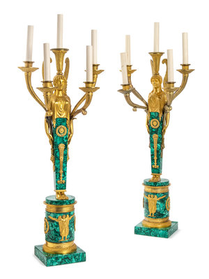 A Pair of Empire Style Gilt Bronze and Malachite Five-Light Candelabra Height 29 inches.