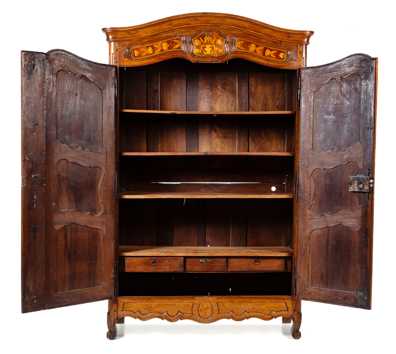 A Louis XV Provincial Style Marquetry Armoire Height 101 x width 58 x depth 26 inches.