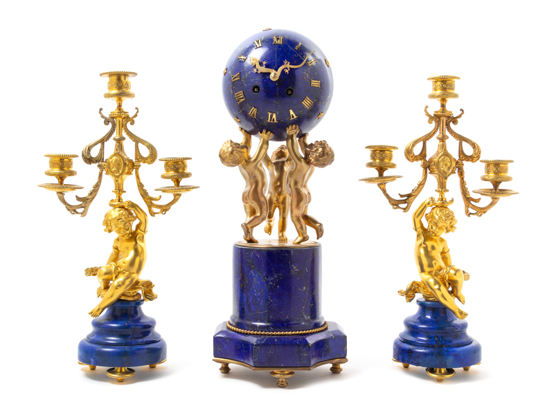 A French Lapis Lazuli and Gilt Bronze Clock Garniture Height of mantel clock 16 1/4 inches.
