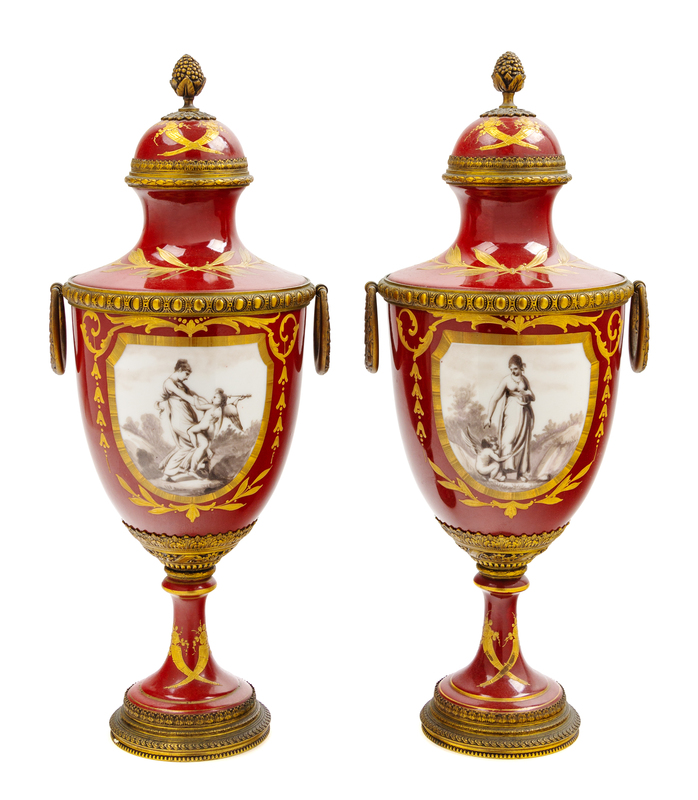 each cover having a pomegranate finial, the bodies decorated with a shield form cartouche depicting Venus and Cupid against a red ground with gilt highlights, stamped FRANCE to the underside.