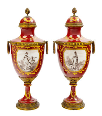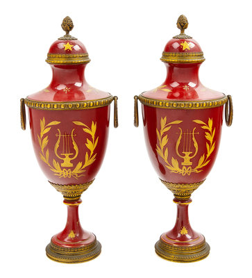A Pair of French Gilt Metal Mounted Porcelain Urns Height 17 1/8 inches.