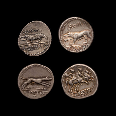 comprising an example from Caius Postumius, P. Satrienus Juba II/Cleopatra Selene II and an example with the obverse decorated with a head of Roma the reverse decorated with two men on horseback.