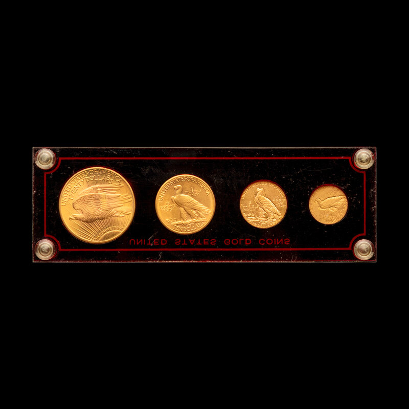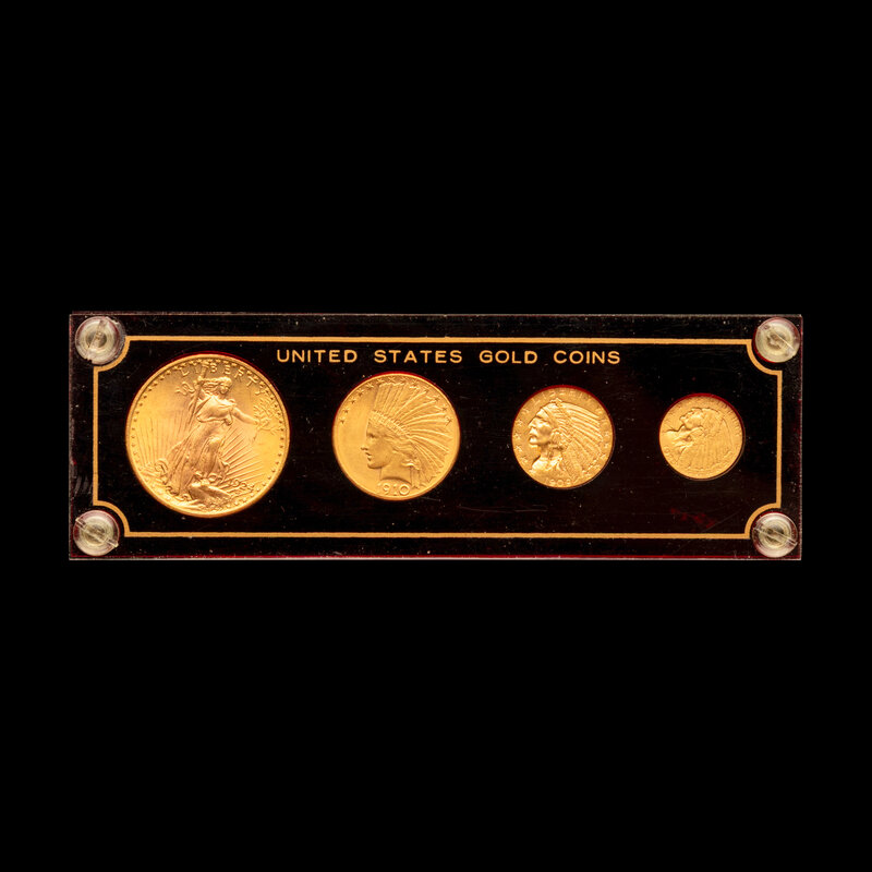comprising a 1924 Saint Gaudens $20, 1910-D Indian Head $10, 1909-D Indian Head $5 and a 1925 Indian Head $2.50 coin.